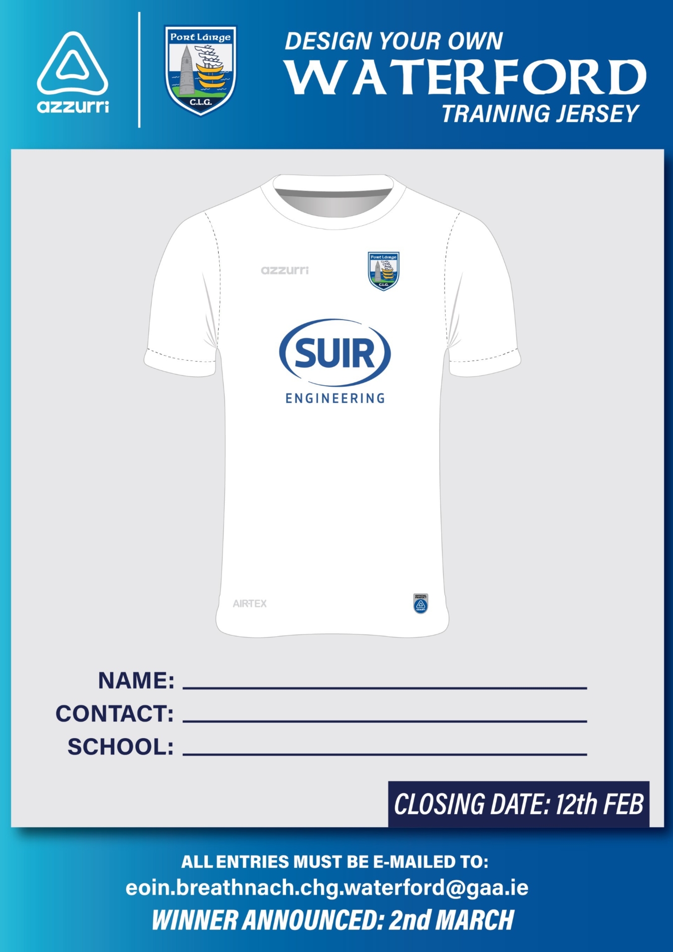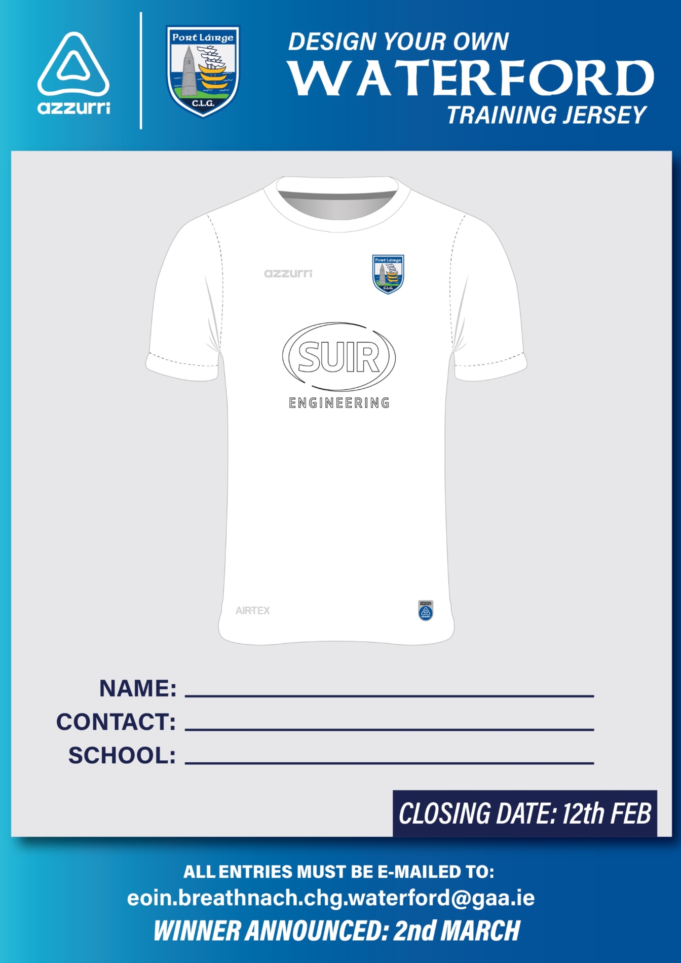 In partnership with Azzurri, this exciting competition gives one young Waterford GAA supporter the opportunity to design an official Waterford GAA Training Jersey for the 2026 season.