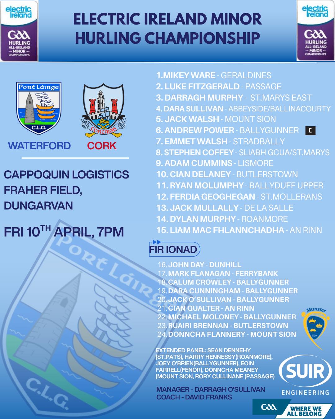 Darragh O’Sullivan & his management team have announced the team to play Cork in the Electric Ireland Minor Hurling Championship on Friday the 10th of April in Cappoquin Logistics Fraher Field, Dungarvan.