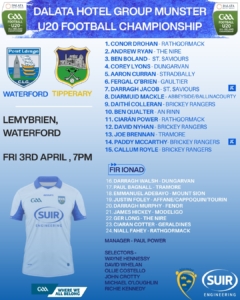 Paul Power & his management team have announced the team to play Tipperary in the Dalata Hotel Group Munster U20 Football Championship on Friday the 3rd of April in Lemybrien.